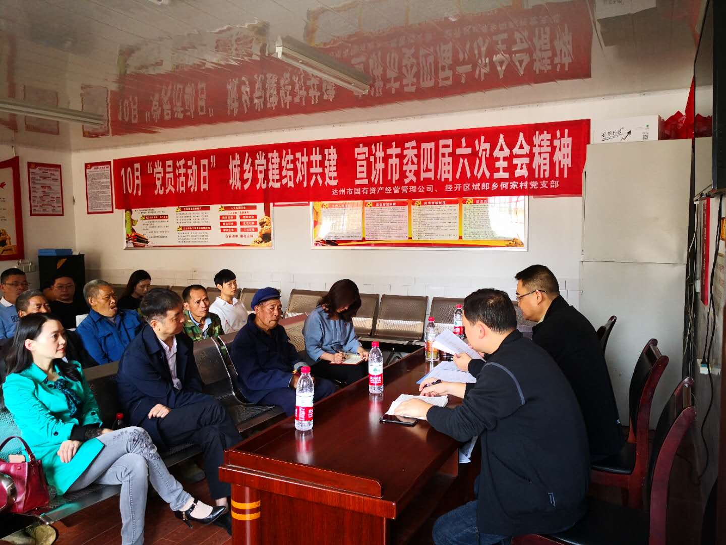 10月10日,市國資經營公司黨支部組織黨員干部深入扶貧村經開區斌郎鄉何家村,與何家村黨支部黨員干部一起聯合開展城鄉黨建結對共建 “黨員活動日”活動,聯學《關于新形勢下黨內政治生活的若干準則》、市委四屆六次全會精神,共商脫貧攻堅、鄉村振興幸福美麗村莊建設舉措,捐贈幫扶資金5萬元,看望慰問結對幫扶貧困戶,組織預備黨員在幫扶村產業園區現場進行入黨宣誓,進一步增強打贏脫貧攻堅戰的信心和決心。